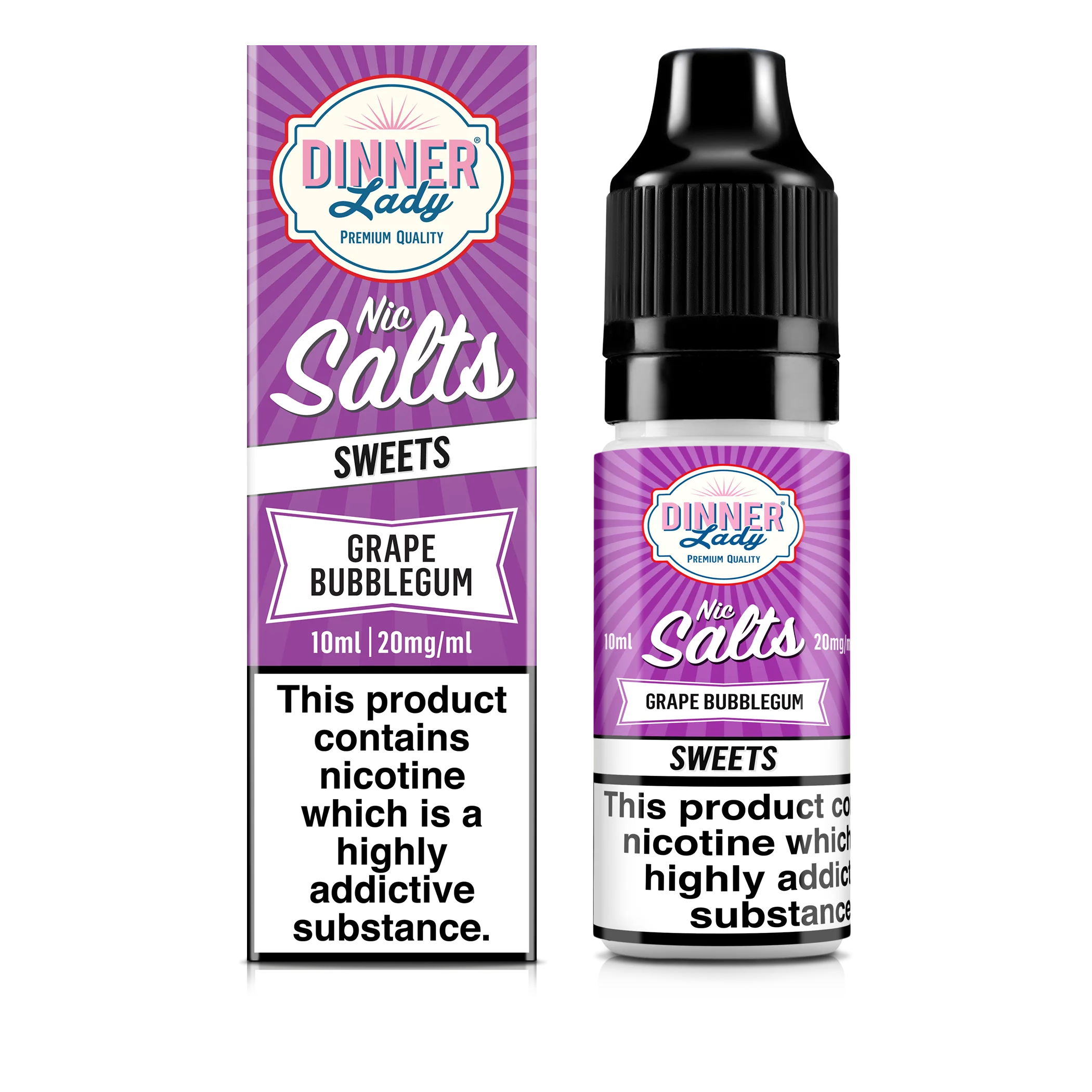 Indulge in the taste of tangy ripe Grapes, perfectly balanced with a juicy nostalgic Bubblegum. Dinner Lady 50:50 Nicotine Salts formulation most closely replicates the experience of smoking traditional tobacco products.